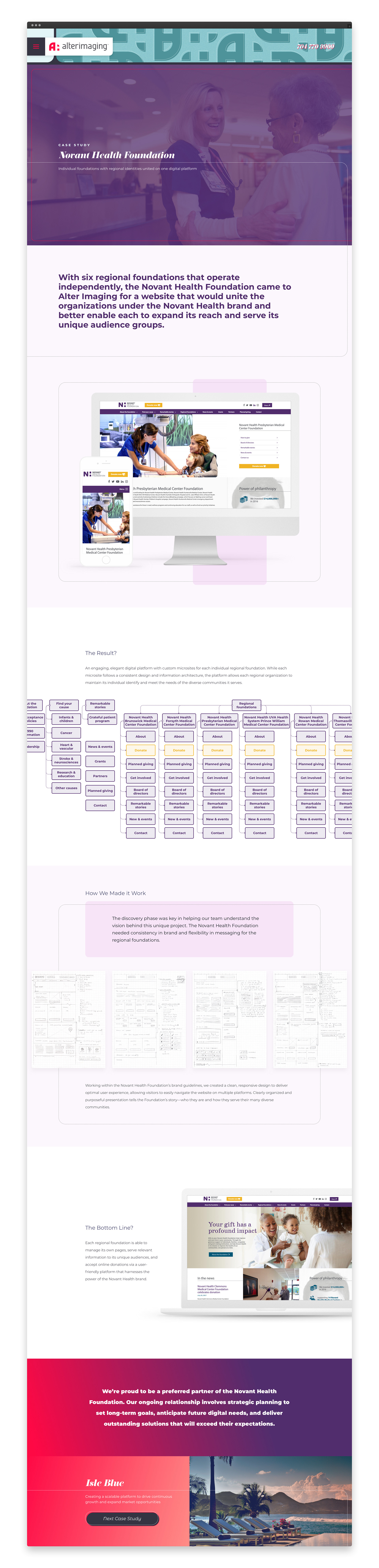 Alter Imaging was a full-service digital design and marketing agency. When I joined the team as the senior designer, the company was suffering from a case of "the cobbler's children have no shoes." The agency’s branding and website had languished in comparison to the work being produced for the clients. It was my job to create a more contemporary, lively visual brand and site design that was more representative of the office culture. With the site design upgrade, I took the opportunity to break away from the templated feel that was currently in place and create a more appealing design that was distinct to the agency. Using more dramatic colors, larger imagery, and iconography in tandem with better use of space in relation to the hierarchy of content, my goal was to create an experience that was fresh and informative.